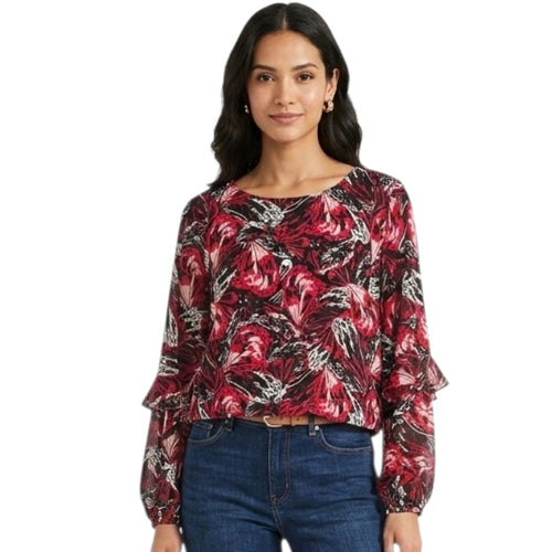 Alfani Women’s Red Black Abstract Print Long Sleeve Ruffle Blouse – Size Large